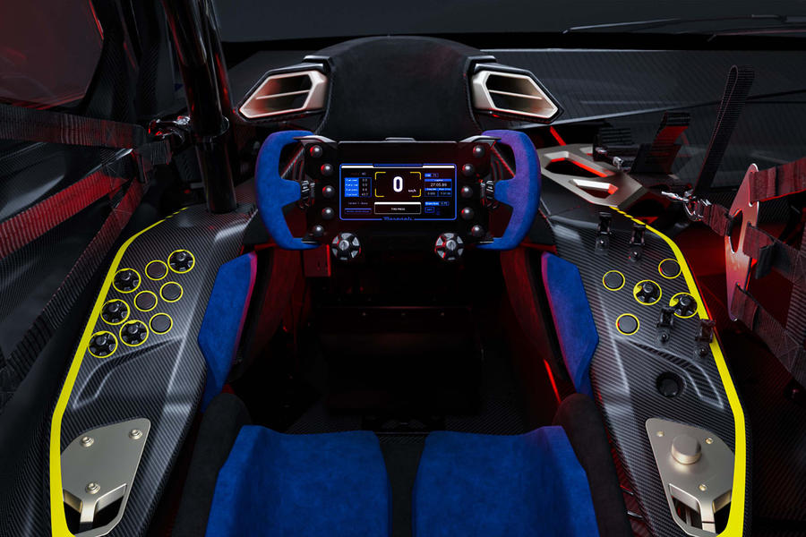 A huge focus has been placed on the interior, too. A single left-hand seat –  complete with a carbonfibre racing wheel with built-in display – is surrounded by different clusters of control knobs and buttons. These control an array of settings, from steering calibration to traction control levels, brake balance, engine strategies and the pit limiter.
