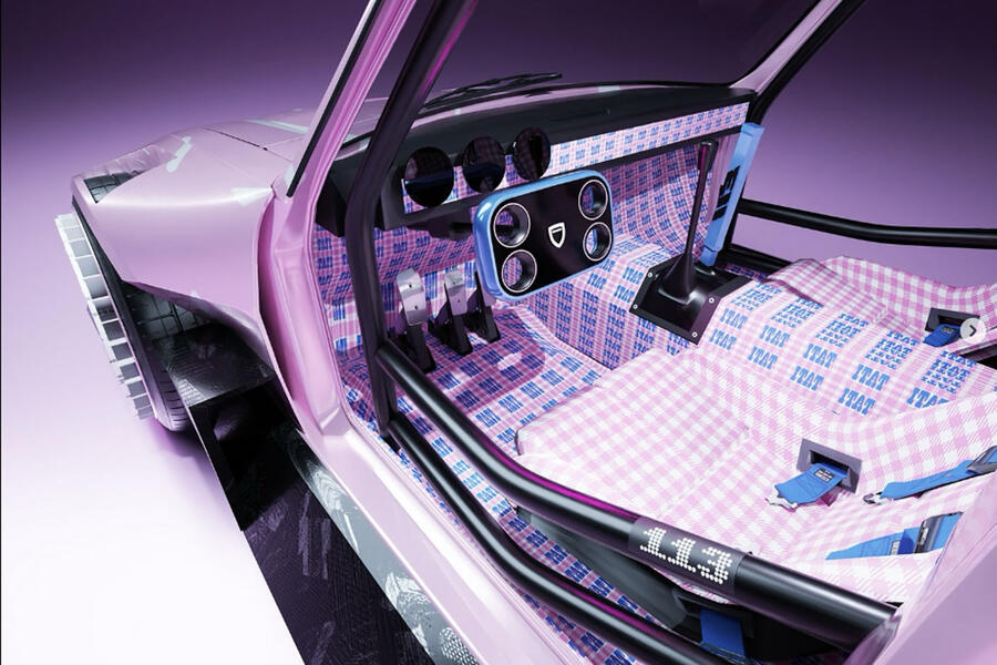 Inside, it gets a set of chequered pink-and-white seats to match the exterior livery as well as the Hypersquare steering wheel that’s set to feature in Peugeot’s next-generation road cars. The rear seats have been removed, replaced with a roll cage.