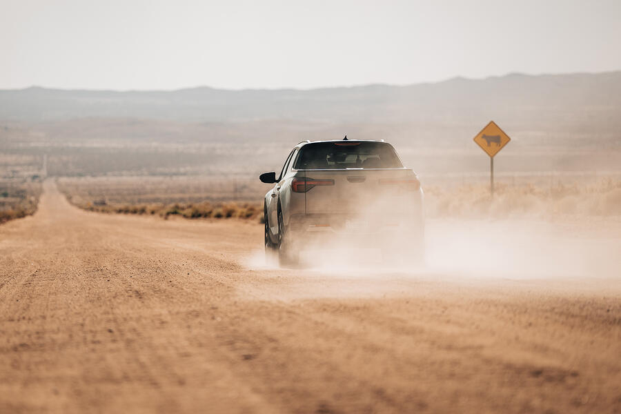 So we go too, off the main highway and onto the dirt track, which you don’t strictly need a pick-up’s 4×4 system to navigate, but which isn’t unhelpful in deeper sand. One suspects this is as hard as most Santa Cruzes will be worked but there’s plenty of terrain like this in the US, and it deals with it nicely, slipping around entertainingly.