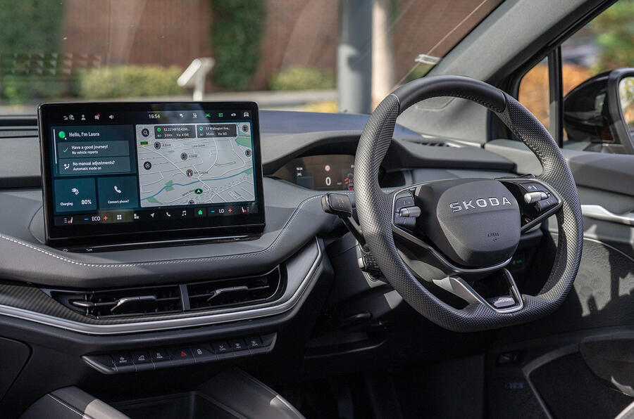 The new Enyaq’s interface is easier to live with. A reworked home screen puts the useful stuff in reach and a new Heaters function lets you activate all the warming features – seats, wheel and more – with a single tap on frosty mornings. Quick-access favourites live in a top bar, so you can jump straight to battery pre-conditioning or Intelligent Speed Assist without diving through menus. It sounds minor, but in daily use it’s the difference between faffing and flowing.